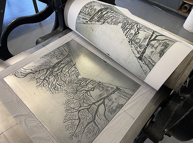The paths that delineate Kelvingrove Park in the West End of Glasgow are a key focus for Fouzia Zafar's current new series of work. Fouzia has always been struck by how many paths were crammed into a small amount of space on a hill. She has tried to capture some of this in the print "Winding Down Kelvingrove Park." The composition invites you to wind up and down the image."